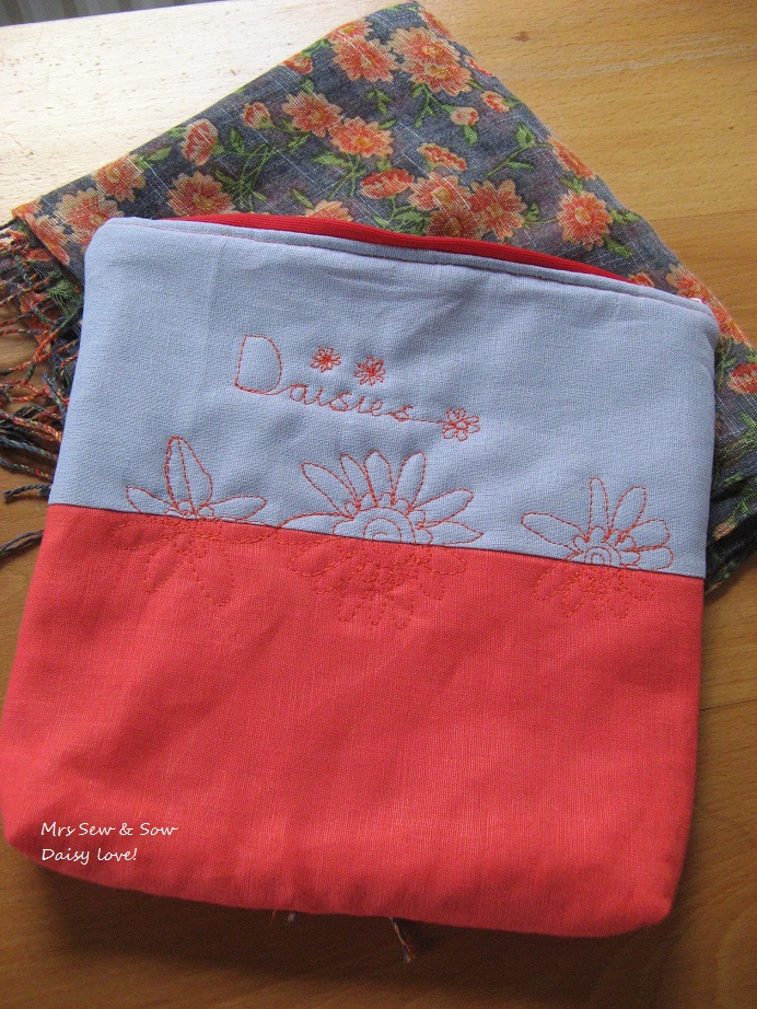I like the daisy pouch, and the linen fabric gives it a nice texture. (Sorry, the weaver in me came out just then!) Nice quilting!